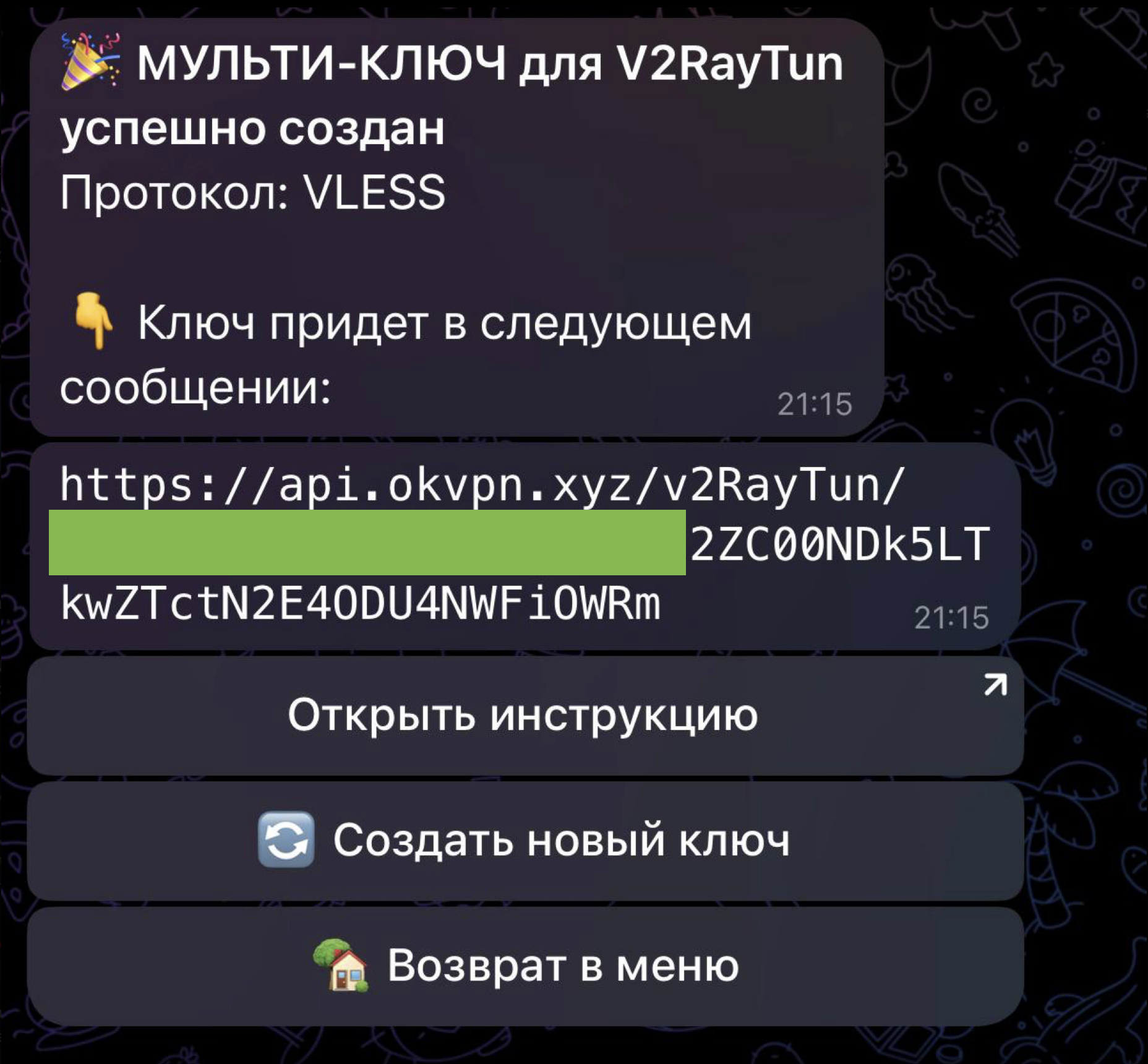 Вам нужен ключ, который выглядит как большая строка со случайными символами и начинается с https://. Ключ приходит после оплаты, но его всегда можно заново получить, если есть активная подписка на OKVpn