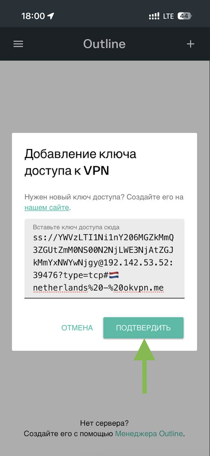 Вставьте скопированный ключ и нажмите на зеленую кнопку «Подтвердить»