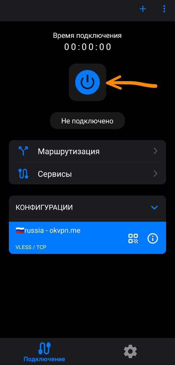 Вы успешно вставили ключ. Нажмите на синюю кнопку в центре, чтобы включить VPN. После подключения кнопка станет зеленой. Чтобы отключить VPN — нажмите на зеленую кнопку